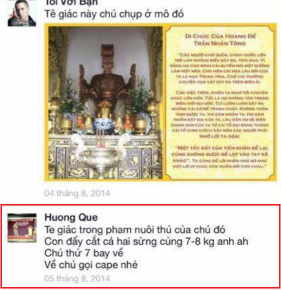 Thậm chí là công khai đăng trạng thái trên facebook mà không cần e dè hay quan ngại bất cứ vấn đề gì “ Tê giác đang trong trang trại nuôi của chú đó, con đấy cắt cả 2 sừng cũng 7-8 kg à, thứ 7 chú bay về, chú rủ đi café nhé”