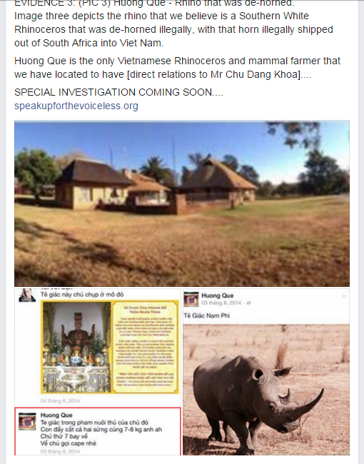 Tài khoản facebook Huong Que được biết đến là tài khoản của bố Khoa, đã có những lời mời gọi một cách công khai và thừa nhận rằng mình đã cắt sừng tê giác sau đó vận chuyển từ Nam Phi về Việt Nam để buôn bán. Ông đã bị theo dõi bởi SAPs và HAWKs nhưng tại sao lại có thể thực hiện những điều trên mà không bị phát hiện, Huong Que đã làm cách nào để vận chuyển nó qua được cửa của Hải quan? Đã có rất nhiều nghi vấn đang được đặt ra.