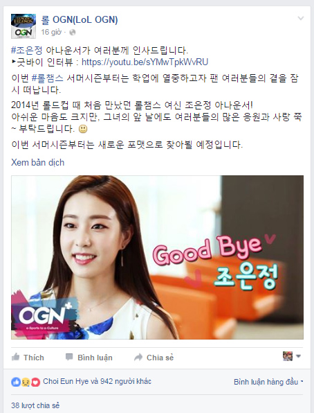 Mới đây nhất, một luồng thông tin không mấy vui đến với những người hâm mộ các giải đấu Liên Minh Huyền Thoại hấp dẫn và cuốn hút các thế hệ trẻ hành tinh hay còn gọi là LCK. Khi mà nữ MC Cho Eun Jung thông báo quyết định chính thức nghỉ việc tại đài truyền hình nổi tiếng Hàn Quốc OGN. Đây được xem là một hung tin đối với người xem truyển hình và fan hâm mộ, bởi trong suốt 2 năm vừa qua, nụ cười của cô đã gây ấn tượng sâu sắc trong lòng mọi người đặc biệt là đối với Faker cùng gương mặt xinh đẹp như thiên thần khi xuất hiện trên truyền hình trong mọi cuộc phỏng vấn cũng như những lần đứng trên sân khấu dẫn chương trình.