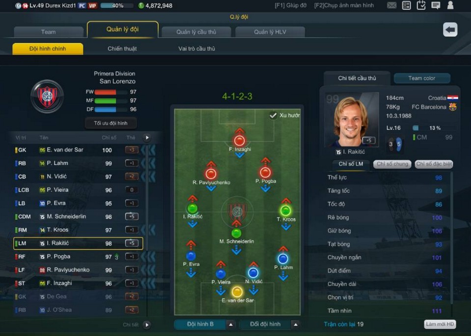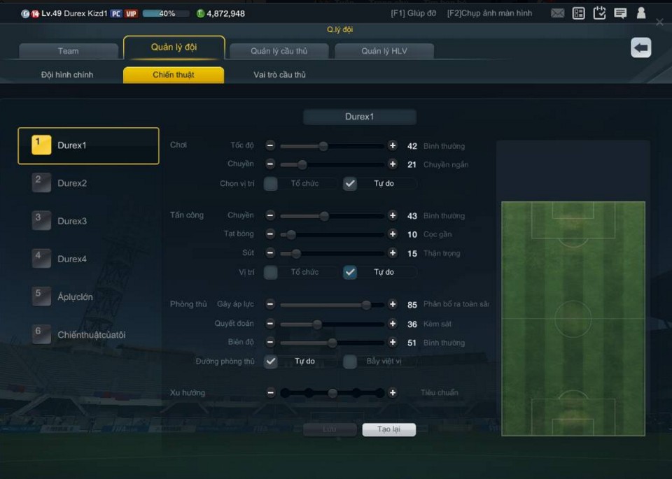 Chú ý: người chơi cần linh hoạt thay đổi đội hình khi gặp phải những đối thủ cũng bắt chiệc sử dụng chiến thuật như trên giống mình. Các game thủ nên sắm cho mình 1 em huán luyện viên buff thể lực để lối chơi được duy trì lâu hơn trong trận.