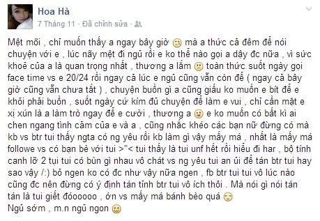 Yêu xa đã khó, yêu xa mà giữ được tình cảm lại càng khó hơn. Biết rõ điều đó, mặc dù chênh lệch múi giờ nhưng Hoa và bạn trai vẫn chủ động liên lạc thường xuyên bằng Skype, chờ đợi nhau kể cả trong lúc người kia đi ngủ. Những video thể hiện tình cảm nhận được khá nhiều “bánh gato” từ những người khác. Kỉ niệm một tháng yêu nhau, Shing Vo (bạn trai Hoa Hà) còn quay video cầm bánh kem để chúc mừng ngày kỷ niệm và gửi cho người yêu.